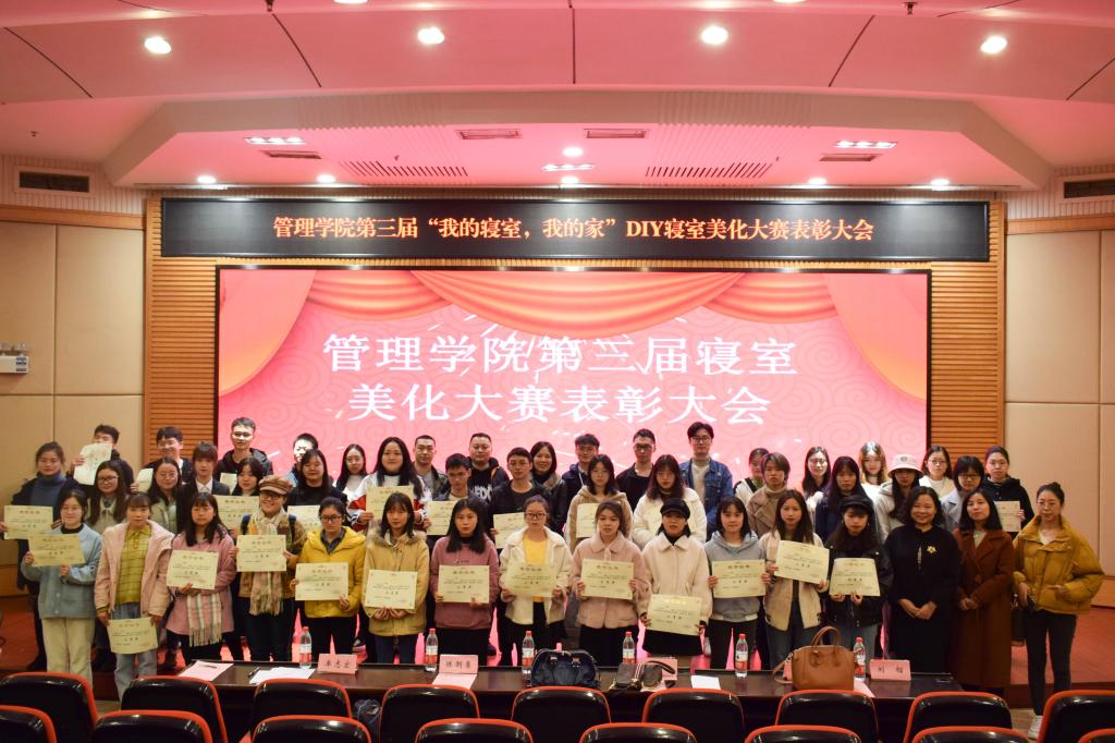 为了营造健康、文明、积极的寝室文化氛围,促进同学之间的交流沟通,创造文明舒适的学习生活环境,丰富同学们的大学生活,2019年11月19日由管理学院主办、管理学院楼栋管理委员会承办的第三届“我的寝室我的家” DIY寝室美化大赛表彰大会在博智楼7200报告厅举行。管理学院分党委副书记、纪委书记王静,学生处公寓管理科陈剩勇,管理学院学工办副主任谭予涵以及辅导员卓志宏、刘榴、张檬出席了本次表彰大会。