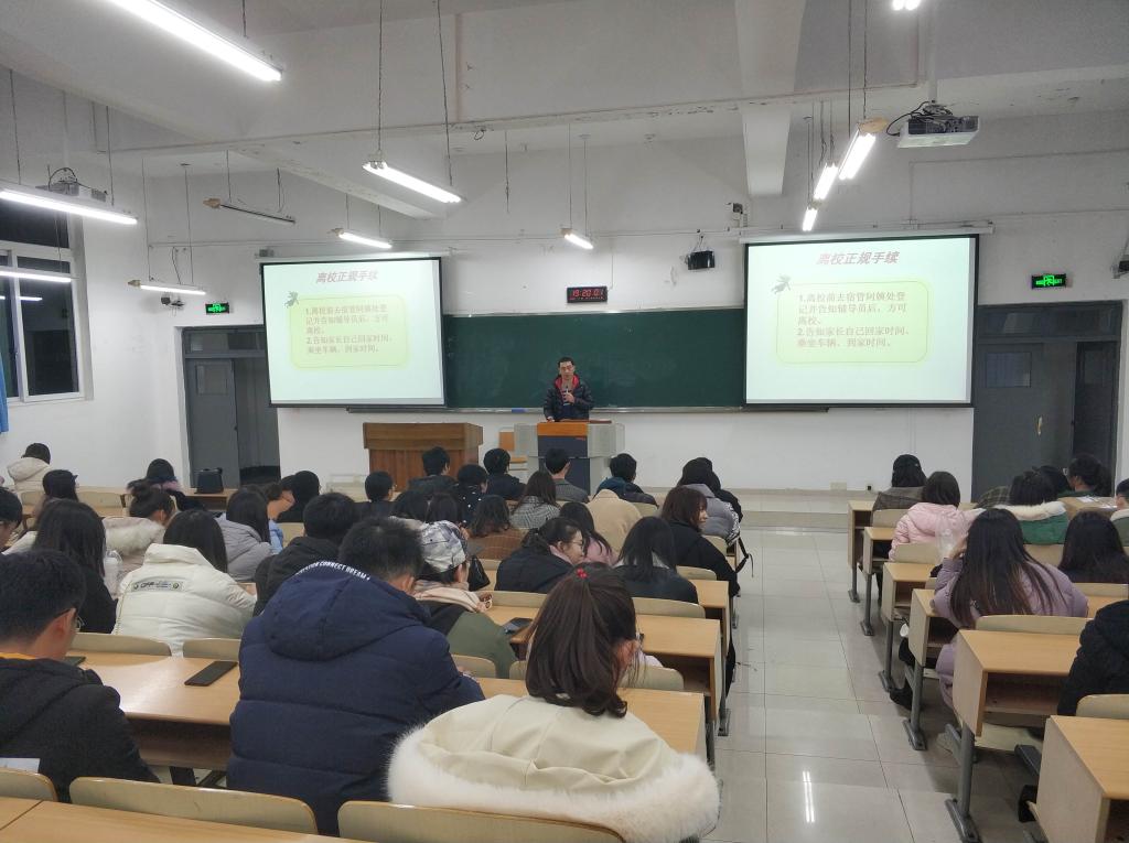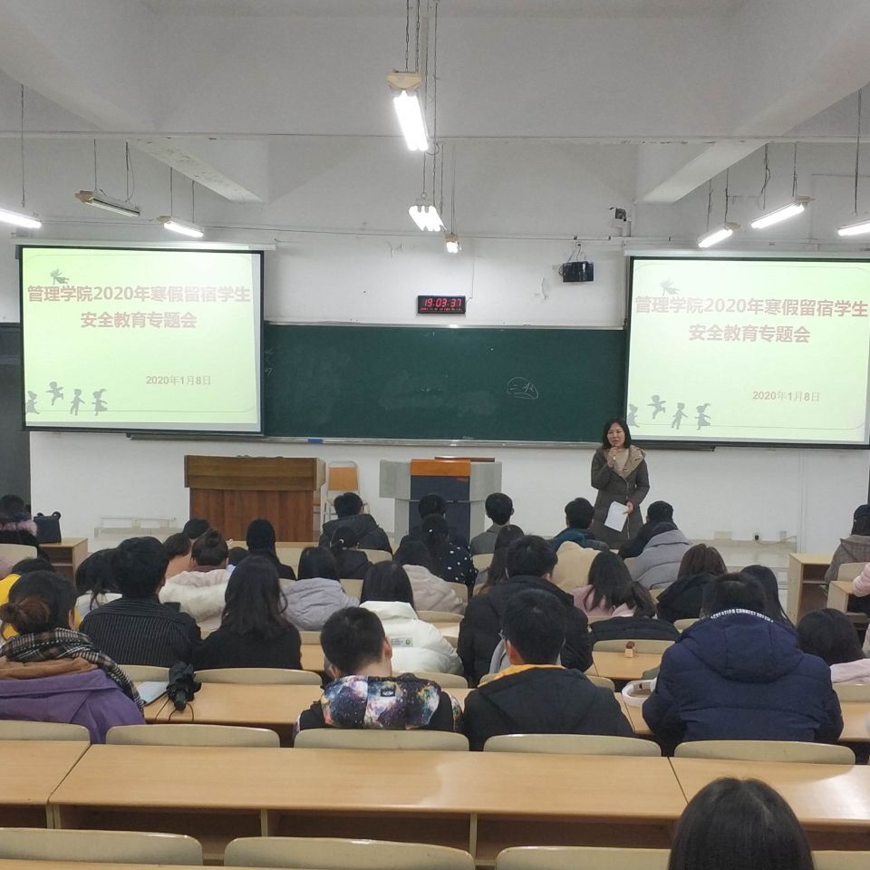 为了加强寒假留宿学生的安全管理,管理学院于2020年1月8日19:00在07207教室召开了2020年寒假留宿学生安全教育专题会。管理学院党总支副书记王静、楼管会主任卓志宏、辅导员聂树平出席了本次会议,管理学院104名留宿学生参加了此次会议。