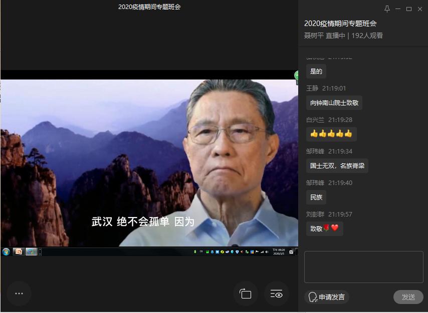 聂树平老师通过视频将复旦大学中国研究院院长张维为教授请到直播间,为同学们解读“中国抗疫的世界意义”。张教授通过美国和澳大利亚如何应对森林火灾,2005年美国如何应对卡特里娜飓风灾害,2009年美国如何应对H1N1病毒等具体事例的对比,彰显了我国社会主义制度集中力量办大事的优越性,有力攻破西方社会别有用心的诋毁言论。同时又以世界卫生组织总干事谭德赛等人士对中国应对疫情行动的赞赏,引导同学们客观理性地对待国际社会舆论,绝不受西方不当言论的蛊惑,坚定对党和国家的热爱,绝不信谣传谣、以讹传讹,做新时代的有为青年。