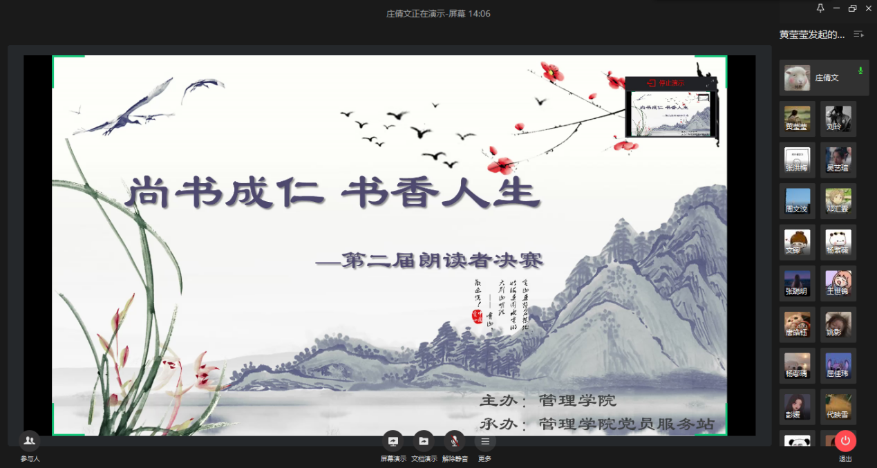 为了提高学生的人文素质和道德情操,进一步培养大学生良好的阅读习惯,推动校园文化建设,由管理学院主办、管理学院党员服务站承办的线上管理学院“尚书成仁·书香人生”第二届朗读者决赛于2020年5月12日晚18:00成功举办,管理学院分党委副书记王静,管理学院学团办主任谭予涵,管理学院辅导员聂树平老师、张檬老师以及管理学院党员服务站指导老师卓志宏,出席了本次活动并担任活动评委。
