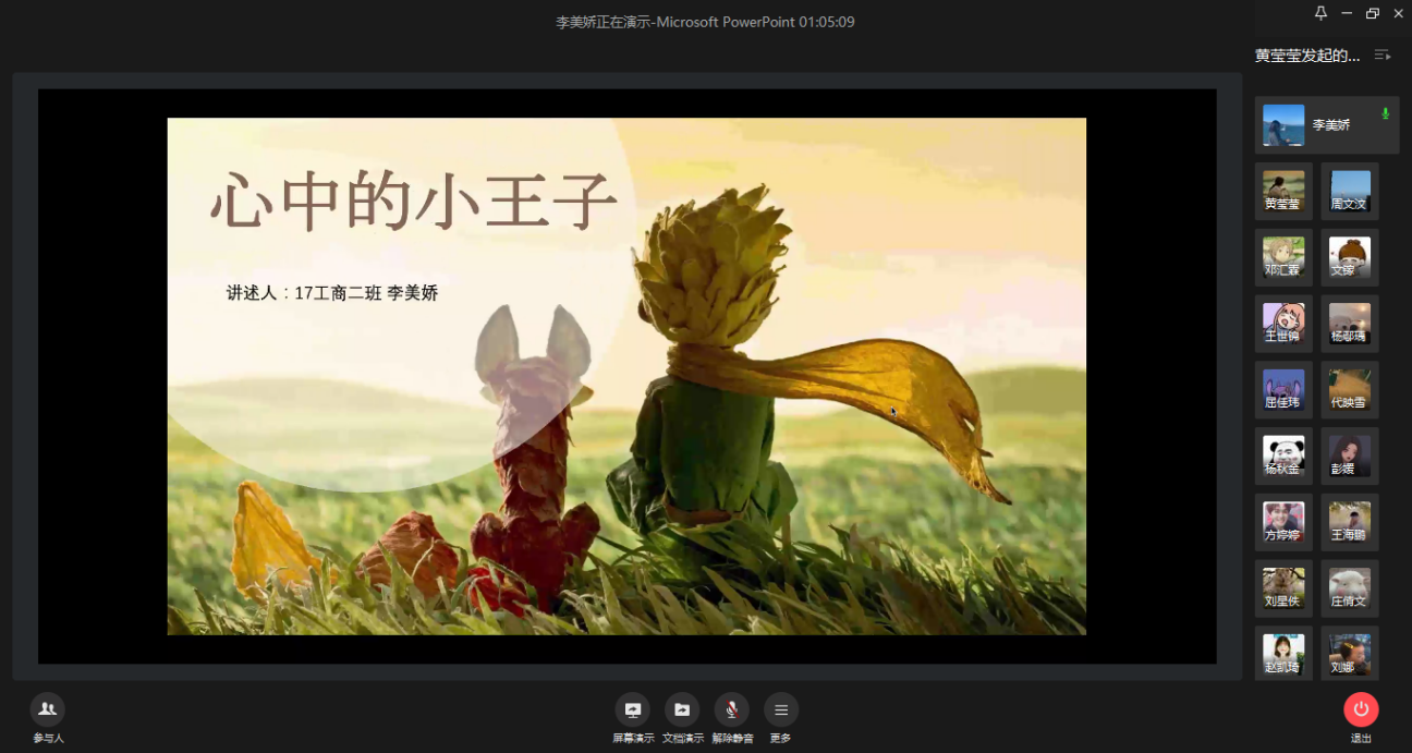 本届比赛历时一个月,经过初赛,共有10名选手进入决赛。比赛正式开始前,卓志宏老师对本届比赛的举办情况进行了介绍,并用周恩来总理“为中华之崛起而读书”的爱国壮志鼓励在线的选手和观众。比赛正式开始后,选手们通过企业微信会议直播的形式来展现作品,参赛作品内容构思巧妙、版面设计精美,参赛选手满怀激情地向评委和观众展示了他们与书的故事,具有极强的感染力。本届比赛采用评委打分和观众投票相结合的方式进行评判,比赛的最终结果为:一等奖获得者李美娇;二等奖获得者陶忠艳、彭媛、唐皓钰;三等奖获得者钟佳欣、胡海天、张烨、姚影、王嘉莹、王怀锋。在总结点评环节里,王静副书记对获奖者表以衷心祝贺,她寄语所有的参赛选手和观众,要好读书、读好书、读活书;她强调,学无止境,我们要树立终身学习理念,博览群书,感悟书中精华。青年学生更应该充分利用良好的学习时光,多读书,读好书,通过读书不断学习知识,掌握文化,拓展视野,丰富人生,在追逐自己梦想的同时,用科学知识为国家社会做贡献!