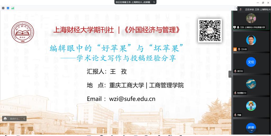 2022年6月9日下午,上海财经大学《外国经济与管理》期刊编辑部副主任王孜博士应邀为122cc太阳集成游戏师生作学术讲座,122cc太阳集成游戏部分教师和研究生共计100余人参加了本次学术交流活动。活动由王永龙副教授主持。