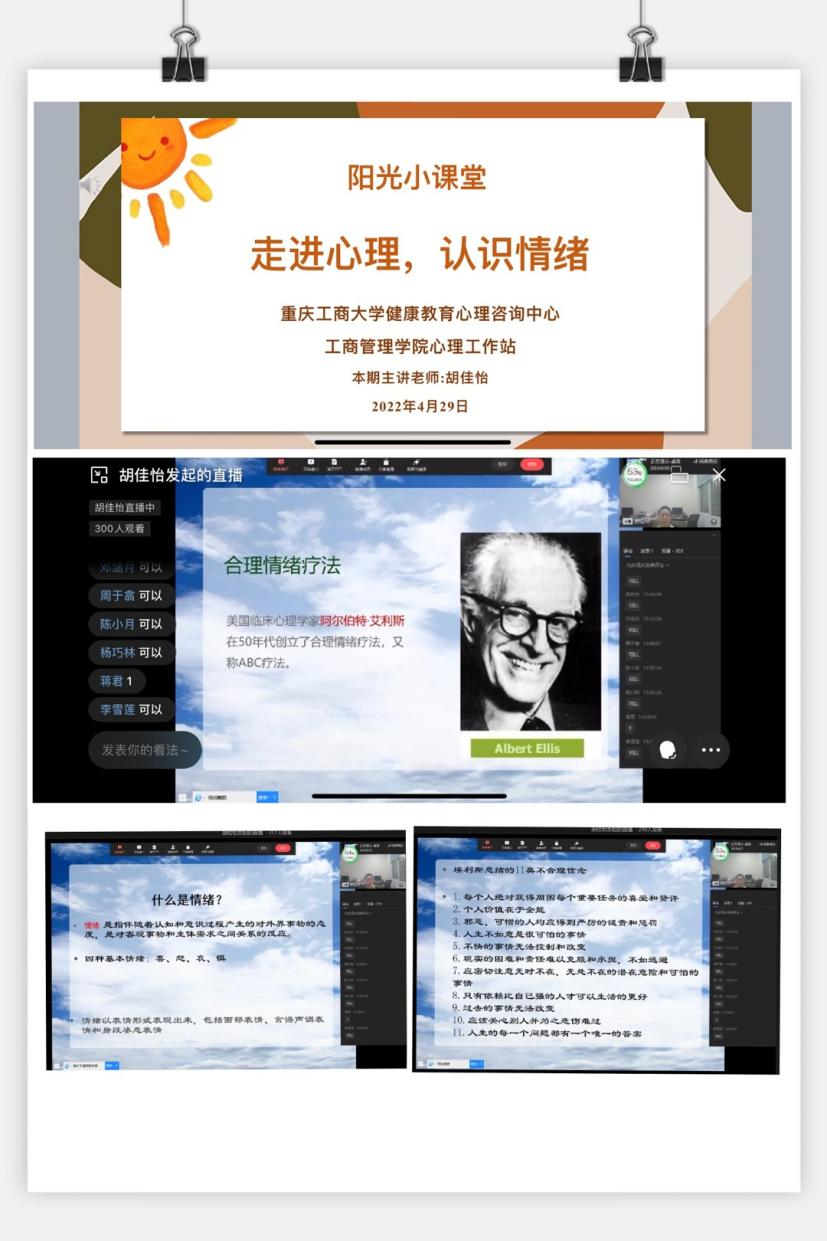 为加强学生心理健康教育,引导学生关注自身发展,树立正确的人生观和价值观,2022年4月29日中午12:35-14:00,122cc太阳集成游戏面向全校学生开展阳光小课堂——“走进心理,认识情绪”线上心理讲座。大学生心理健康教育与咨询中心负责人胡佳怡受邀担任讲座主讲。学院心理工作站长、心理委员等412人参与培训,累计评论265条。
